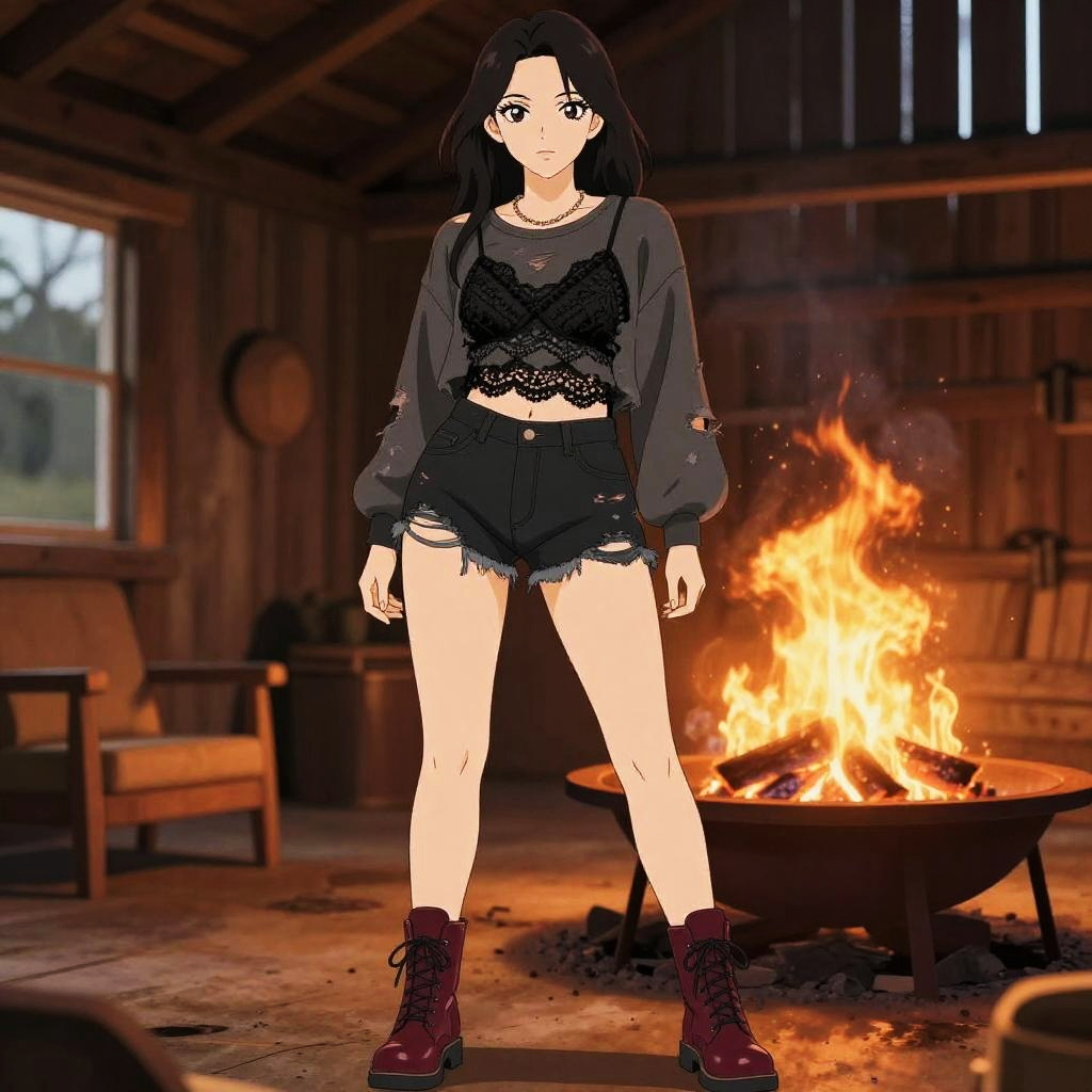 A Stocky woman, in a grunge-inspired outfit featuring a distressed long-sleeve top in faded charcoal, ripped black denim shorts, and burgundy leather lace-up combat boots, stands confidently at a fire pit in a rustic barn, illuminated by warm flames, with a lightweight chain necklace and layered scalloped-lace black camisole peeking through, all rendered in a vibrant Toei animation style. Sexy. Pretty face and beutiful eyes
