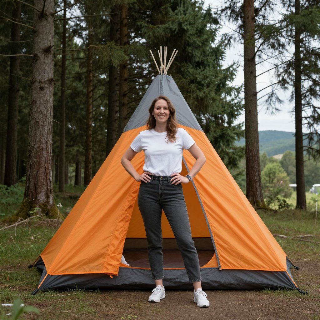 Photograph of a young woman standing confidently in front of an orange and gray triangular tent in a forest. She has long brown hair, fair skin, and is smiling with arms crossed. She wears a blue zip-up jacket, black pants, and white sneakers. The tent has a small stick pole at the apex and is set on a patch of grass with tall pine trees in the background. The overcast sky casts a soft light, highlighting the greenery and creating a serene, outdoor camping atmosphere.
