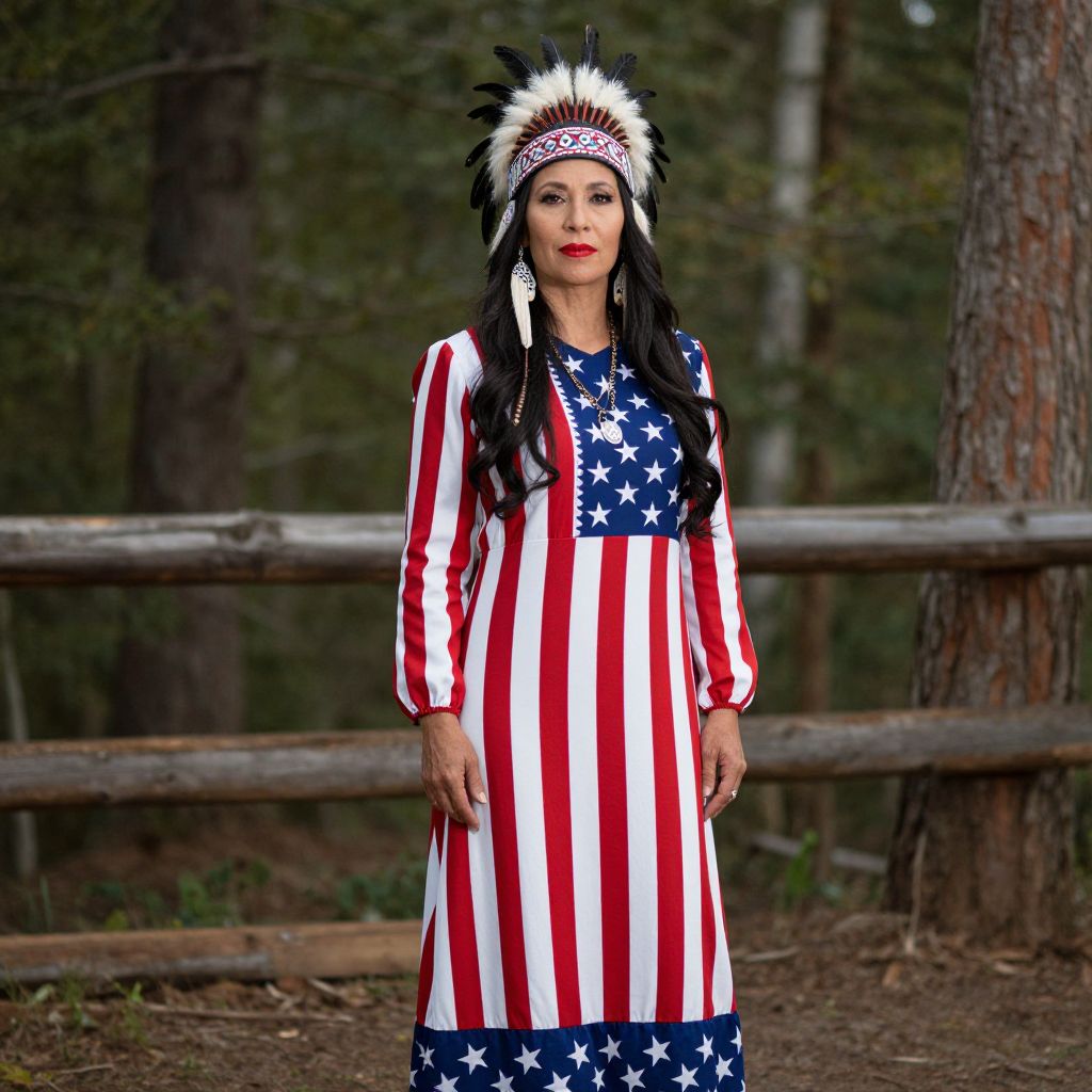 In this captivating image, a woman stands gracefully in a traditional Native American setting, exuding a sense of pride and cultural heritage. She is adorned in a striking dress that mirrors the American flag, with red, white, and blue stripes and stars, symbolizing unity and freedom. The dress is complemented by a headdress that features a black and white pattern, reminiscent of Native American designs, adding a touch of authenticity to her attire. Her long, dark hair cascades elegantly, framing her face, which is accentuated by a bold, red lip color. She wears a necklace and earrings that add a touch of elegance to her ensemble. The background is a serene forest, with a wooden fence and a tree trunk providing a rustic, natural setting that complements the traditional theme. The overall composition is harmonious, with the woman positioned centrally, drawing the viewer's attention to her and her cultural attire.