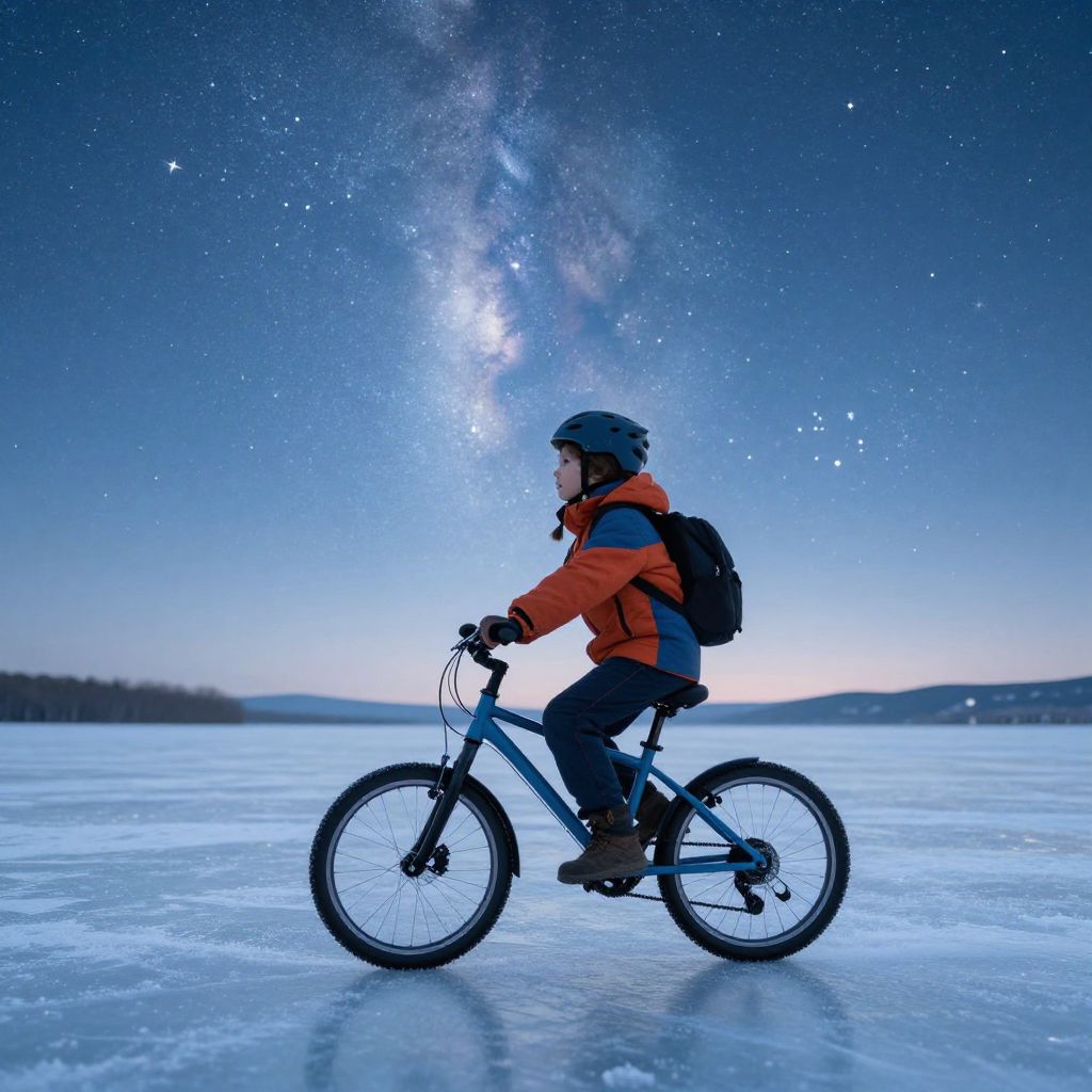 Child riding a teal bicycle with frost-covered wheels through a snowy landscape under a starry sky, wearing a winter outfit and backpack.