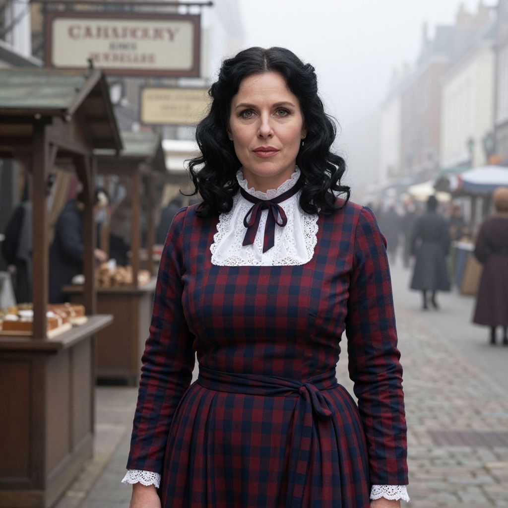Photograph of a middle-aged woman with sharp cheekbones, deep green eyes, and a wavy black hairstyle, dressed in a traditional British costume including a full-length checkered dress with deep red and navy stripes, a lace collar, and a wide sash, standing in a Victorian-era market with painted signs, wooden stalls, and a foggy London street backdrop.. The woman has big tits and cute face