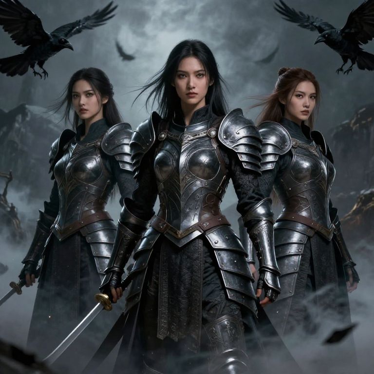 This striking fantasy artwork features three powerful female figures clad in dark, intricate armor, embodying a fierce warrior aesthetic. The dramatic setting is enhanced by swirling mist and ominous ravens, creating a captivating atmosphere that evokes a sense of mystery and strength.