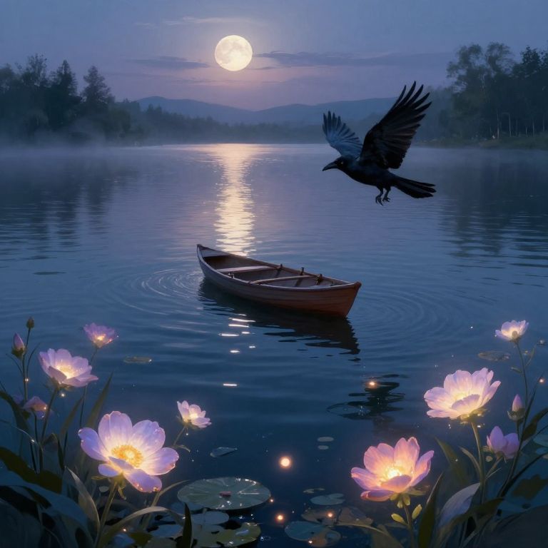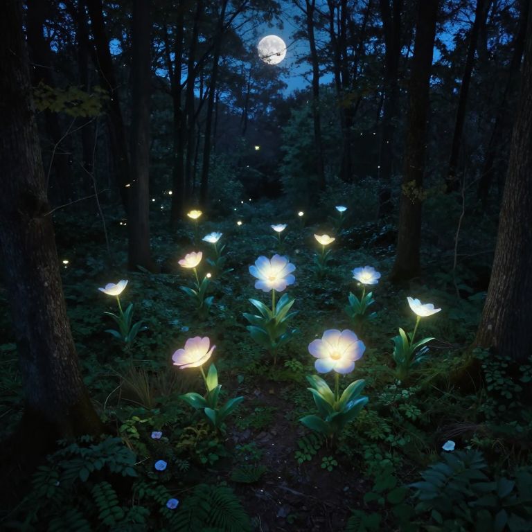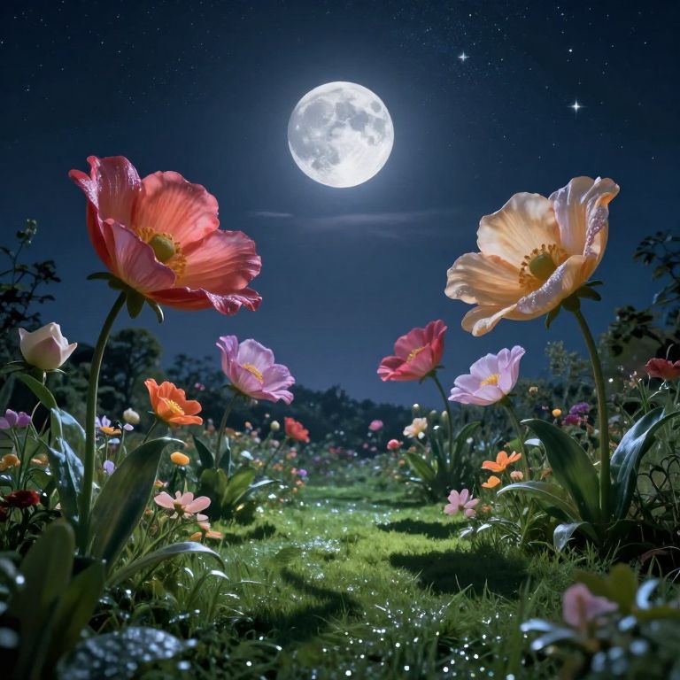 A dreamlike landscape bathed in the soft light of dusk, this tranquil garden is viewed from beneath a deep, shimmering pool's surface. A solitary, vibrant moon hangs low on the horizon, casting an enchanting and eerie glow across the water and surrounding foliage. Delicate flowers with iridescent petals sway gently, their pastel hues blending harmoniously to create a mesmerizing, atmospheric scene that shifts from serene tranquility to a hint of mystique as the viewer becomes immersed in this otherworldly realm where nature and fantasy intertwine in an enchanting dance.