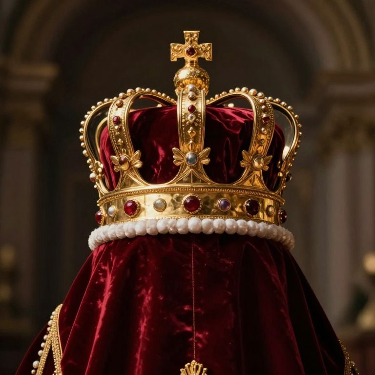 An aura of solemn reverence envelops the regal insignia, symbolizing the weight of legacy and the transient passage of power, as the golden crown and velvet mantle evoke a poignant blend of majesty and melancholy.