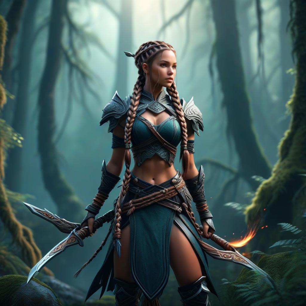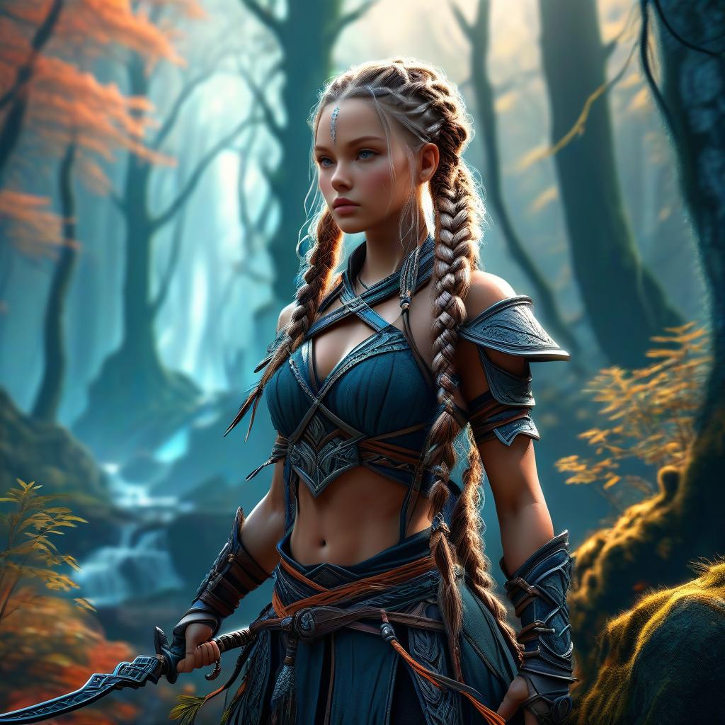 3D rendering of a hot fantasy warrior with cascading braids, posing in front of a mystical forest.