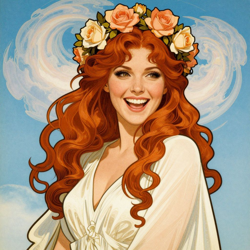 A vibrant pop art poster features a woman with a radiant smile, adorned with a floral crown, set against a light blue sky, reminiscent of Alphonse Mucha's style.