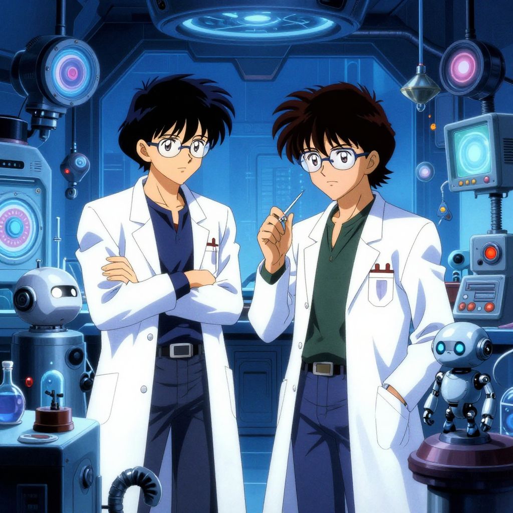 Wireframe Model a lawyer and an adorable little robot sitting next to each other in a cubicle working on their computers, in the style of 90s anime, vibrant colors,