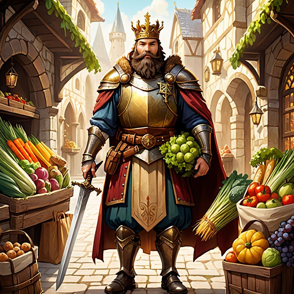 A fantasy scene featuring a large, bearded king character wearing a golden crown and medieval armor mixed with everyday clothing, holding a large sword in one hand and grocery bags filled with fresh vegetables, fruits, bread, and bottles in the other. The setting is neutral with soft lighting highlighting the character's rich details and textures. The style is painterly with vibrant and warm earth tone colors, showing a blend of fantasy medieval and contemporary elements.