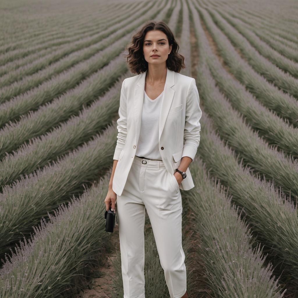 Portrait of a fashionable woman standing in a lavender field. She has natural curly hair and wears a minimalist white blazer and matching tailored pants with a white cotton t-shirt. The setting features neat rows of lavender plants extending into the background, creating a calm and elegant atmosphere.