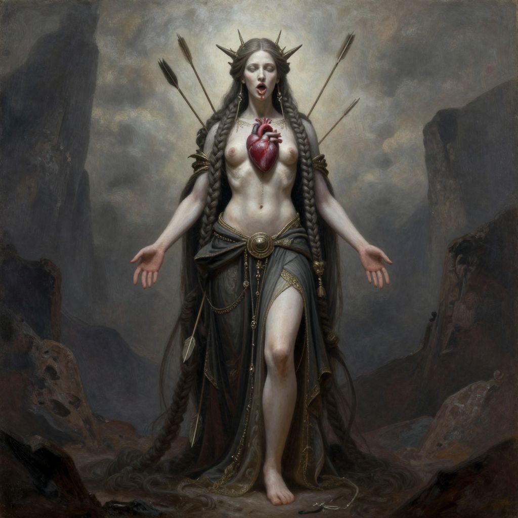 The image depicts a striking figure, a goddess of destiny and death, standing in a dramatic, wide-angle digital painting with muted, ethereal colors. The large, anorexic woman has a gaping hole in her chest, revealing her heart, which she holds in her mouth. Her long, braided hair falls to the ground, creating a sense of weight and gravity. She is riddled with arrows, adding to the sense of her being a symbol of both power and vulnerability. The figure is gigantic, filling the entire frame of the image, and is adorned with intricate, dark, and ornate clothing and accessories that contrast with her pale skin and the muted background. The overall composition is balanced, with the figure centrally positioned, and the background elements, such as the dark, rocky cliffs, enhancing the dramatic and otherworldly atmosphere of the scene.