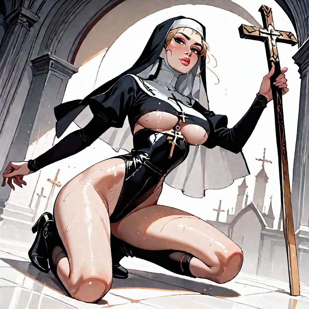 Full_body, score_9, score_8_up, score_7_up, (masterpiece, best quality, ultra high res:1.1), uncensored, prefect lighting, side_light, rating_explicit, girl, 20yo, (sweat and pure:1.1), Rembrandt Lighting Style, sinnun, nun underboob, cross, leotard, (covered nipples:1.3), gigantic breasts, covered navel, in the middle of a crowded street