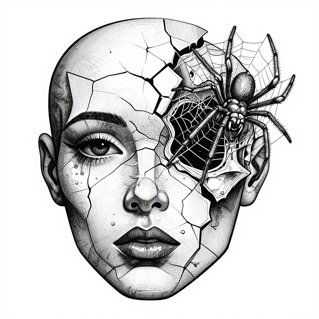 The image depicts a highly detailed, intricate black and white ink drawing of a woman's face, which appears to be cracked open and broken, revealing a spider emerging from the skull. The face is composed of geometric shapes and patterns, giving it a woodcut-like texture. The cracks and fractures in the face are meticulously rendered, adding a sense of depth and realism to the artwork. The spider, with its delicate legs and intricate web-like structure, emerges from the skull, adding a surreal and eerie element to the composition. The overall arrangement of the elements creates a sense of tension and unease, as if the face is in the process of being torn apart. The interplay of light and shadow, along with the use of negative space, enhances the depth and complexity of the drawing, making it a visually striking and thought-provoking piece of art.