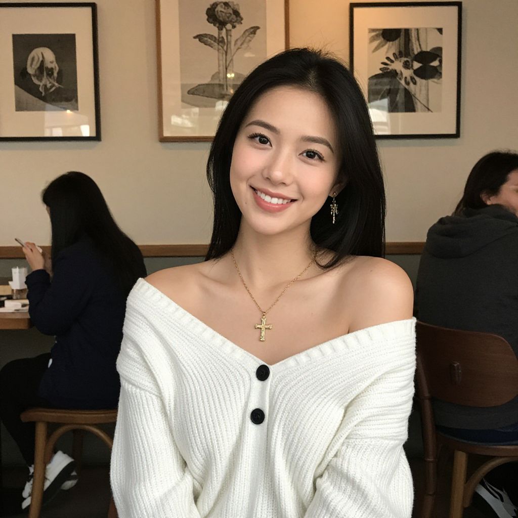 Photograph of an Asian woman with long, straight black hair, smiling at the camera. She wears a white, off-the-shoulder, ribbed knit sweater with black buttons and a gold cross necklace. She has light skin, delicate features, and is wearing small, dangling earrings. The background shows a café with two black-and-white framed floral and abstract photographs on a white wall. Two other people, one with long dark hair in a grey sweater, are seated at wooden tables, facing away from the camera. The café has dark wooden accents and a cozy atmosphere.