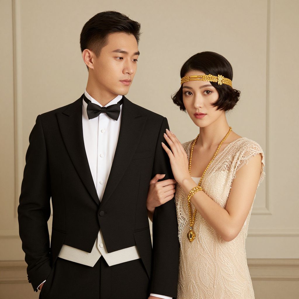 This photograph features a young Asian couple in a vintage style. The man, with short black hair, wears a black tuxedo with a white dress shirt and black bow tie, standing to the left. The woman, with short black bobbed hair, wears a cream-colored, lace, short-sleeved dress and a gold headband with intricate designs. She also wears a long gold necklace and matching bracelet, gently touching the man's chest. The background is a plain, light-colored wall with subtle paneling. The overall image exudes a retro, elegant ambiance.