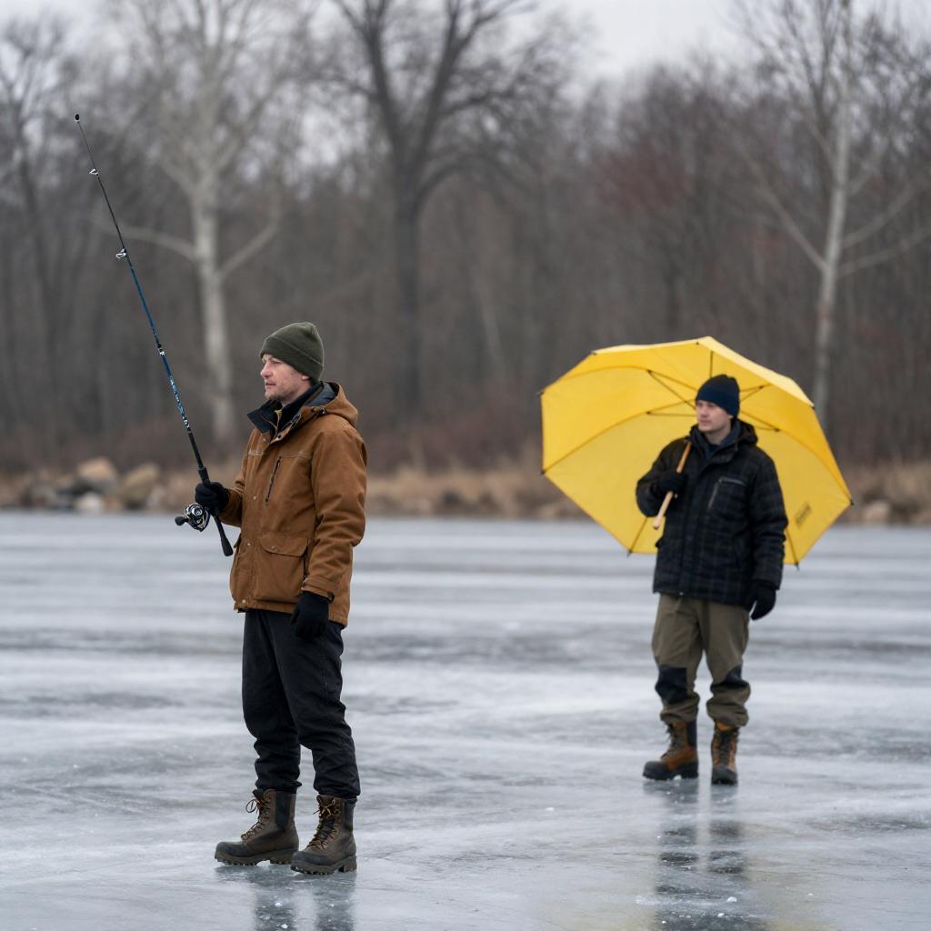 Photograph of two men in winter clothing. The man on the left has short blonde hair, red jacket, and blue jeans. The man on the right wears a black cap, navy jacket, red pants, and carries a yellow glove and brown fur. Snow-covered background with trees and a parked car. Both men have neutral expressions. Snow on their clothes. The man on the right holds the man on the left's arm.