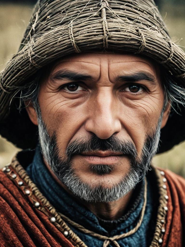 Man in Medieval Peasant Costume, close-up detailed headshot with earthy textures