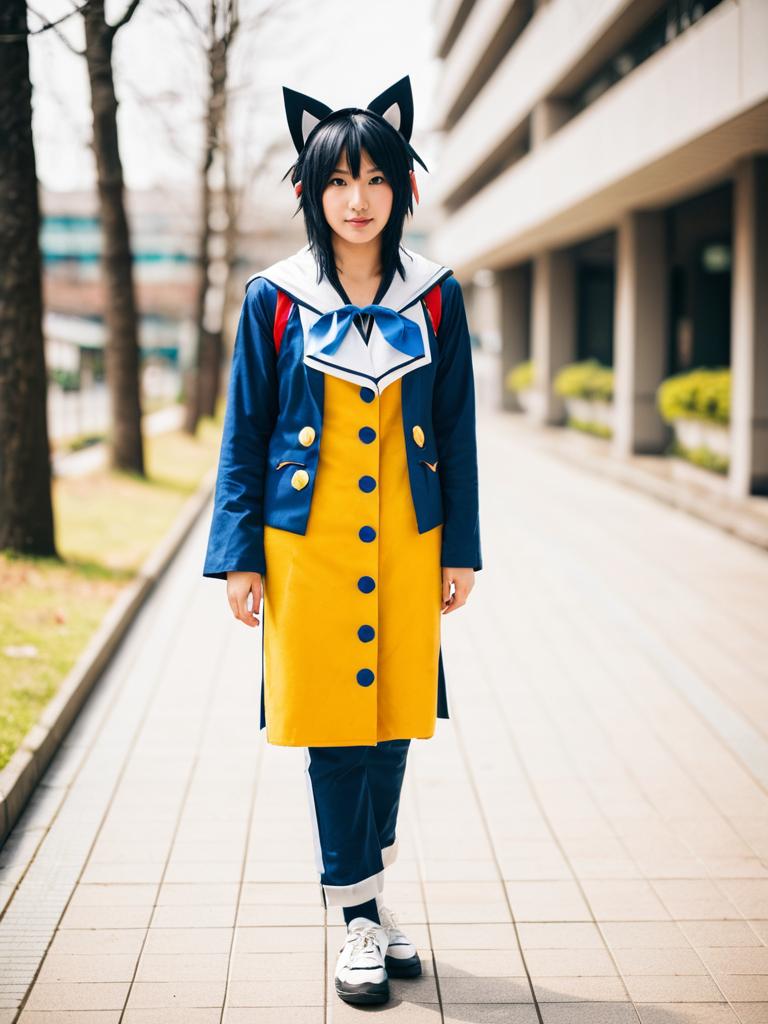 Photo-realistic cosplay photo of person in aizawa yuuichi costume. lifestyle stock photo, shallow depth of field, lifestyle stock photography, shallow depth of field, natural lighting, warm tones, soft background blur, candid moments, vibrant colors, realistic textures, modern casual clothing. full body shot