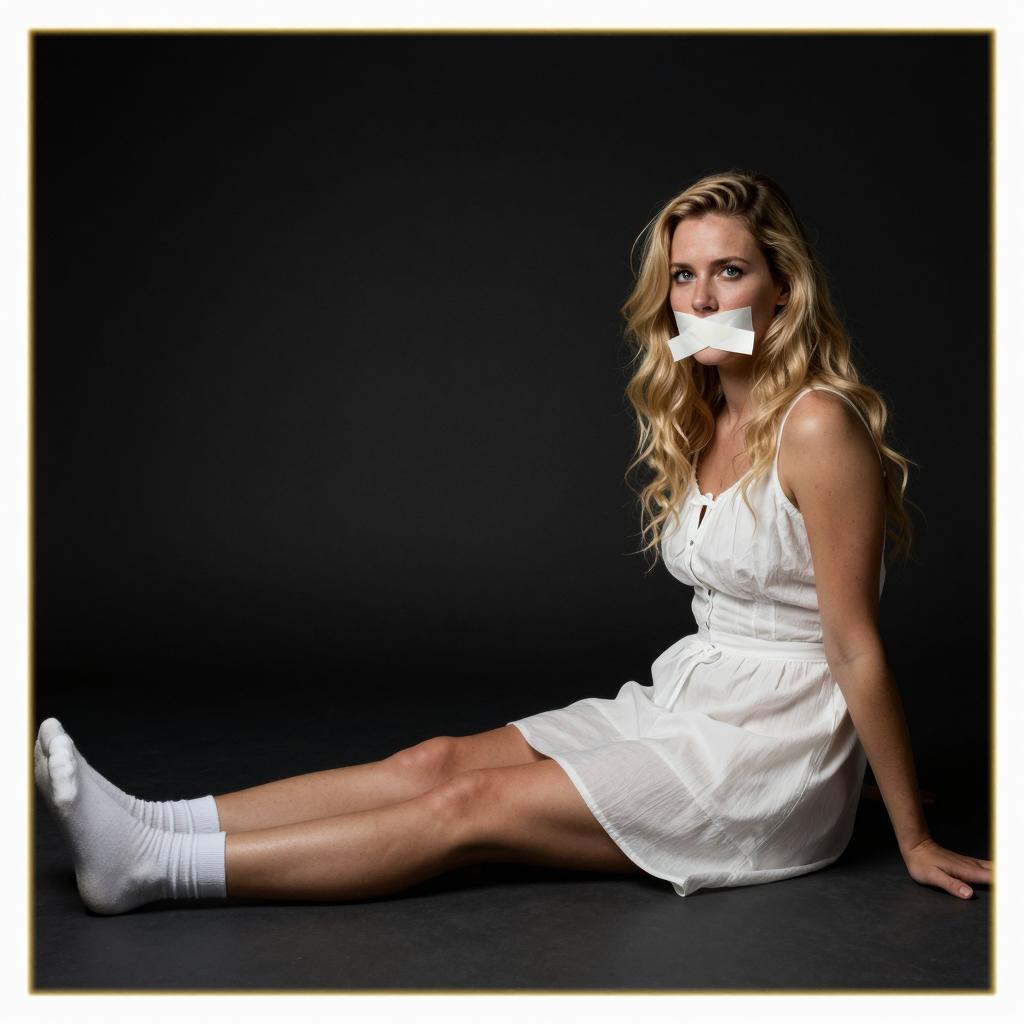 Young girl with long, light brown hair, tied to a plain white wall. Her eyes are wide with fear. She wears a floral-patterned shirt. White duct tape covers her mouth. She leans slightly to the right, shadow on the wall.