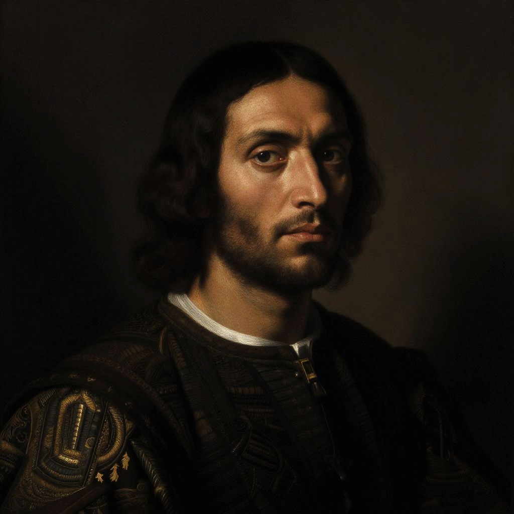 Portrait of fair skin black hair man with intense gaze, dramatic chiaroscuro lighting, detailed textures on clothing, Renaissance painting style