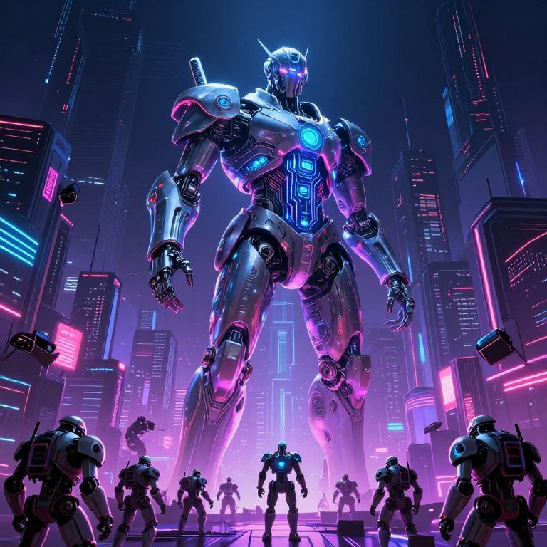 This digital CGI image depicts a futuristic cityscape at night, illuminated by vivid neon lights in pink, blue, and purple hues. Dominating the scene is a towering, humanoid robot with a sleek, metallic silver body, glowing blue and purple accents, and intricate circuitry patterns. The robot stands in the center, towering over a group of smaller, humanoid robots in the foreground, who are positioned in a semi-circle, seemingly preparing for battle. The background features tall skyscrapers with brightly lit signs and holographic advertisements. The overall style is highly futuristic and cyberpunk, with a focus on vibrant lighting and advanced robotic technology.