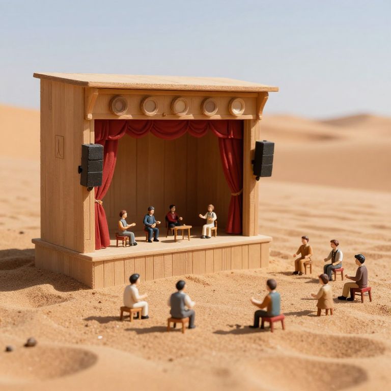 A desert where each grain of sand is a miniature theater, hosting continuous plays performed by nano-sized puppeteers.