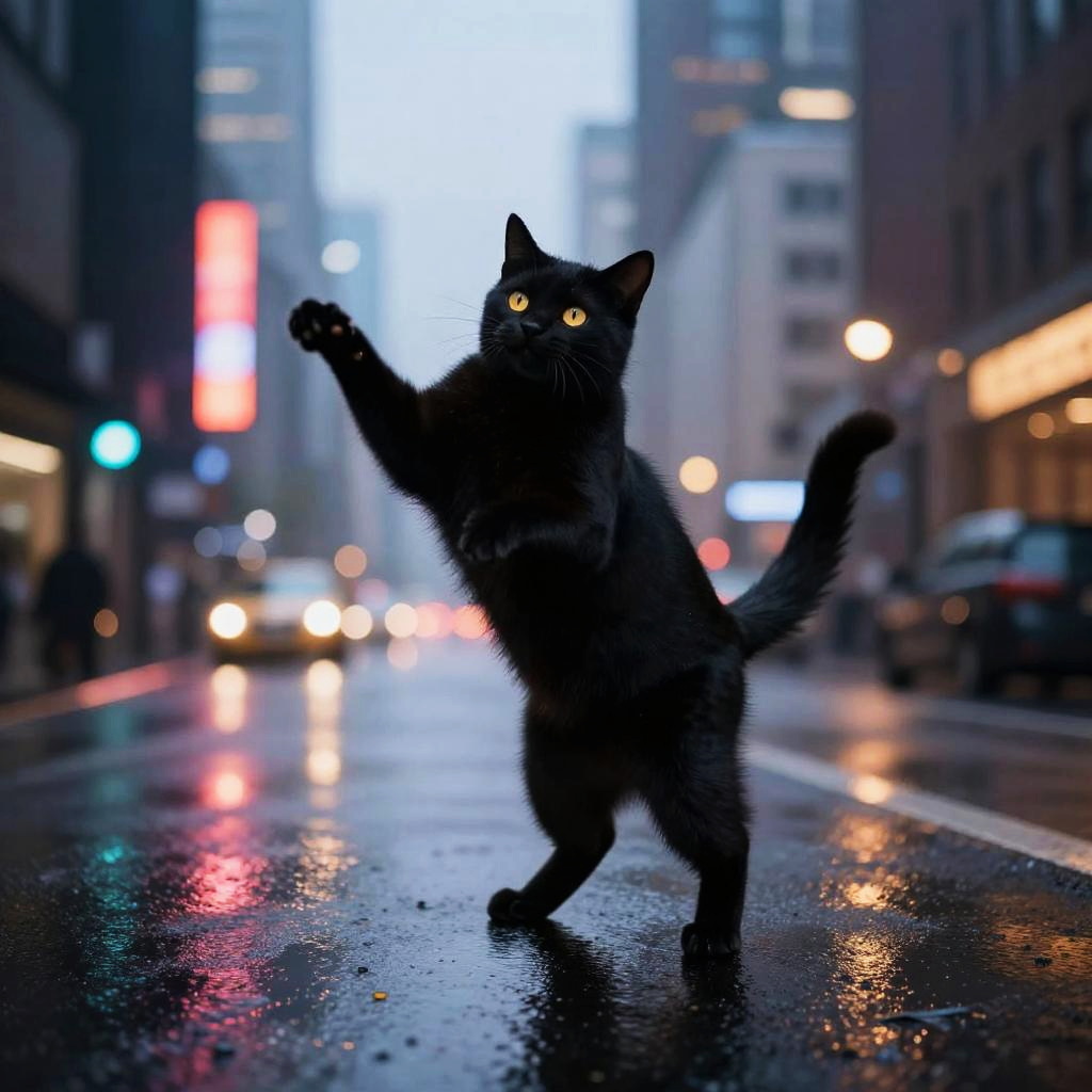 Dancing black cat in a surreal cityscape at twilight, reflective wet streets, dynamic motion blur, glowing eyes, magical realism, cinematic lighting, vivid hues