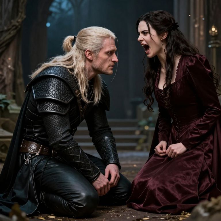 55 mm portrait photo of geralt cowering while being yelled at by yennefer of vengerberg. magical atmosphere. art by greg rutkowski. highly detailed 8 k. intricate. lifelike. soft light. nikon d 850.