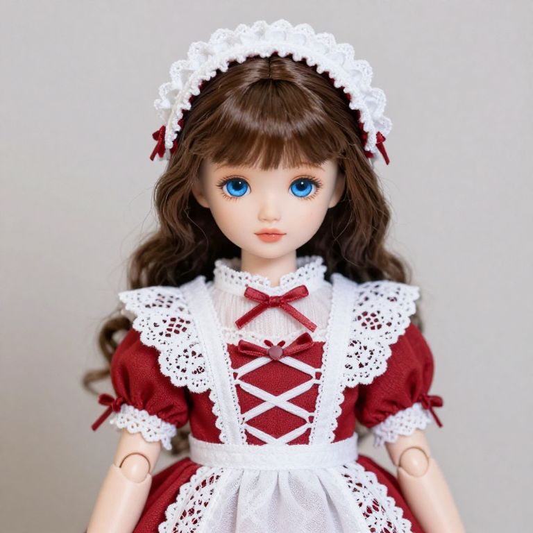 Female doll with brown hair and blue eyes wearing a red dress with white lace trim and a white bonnet.
