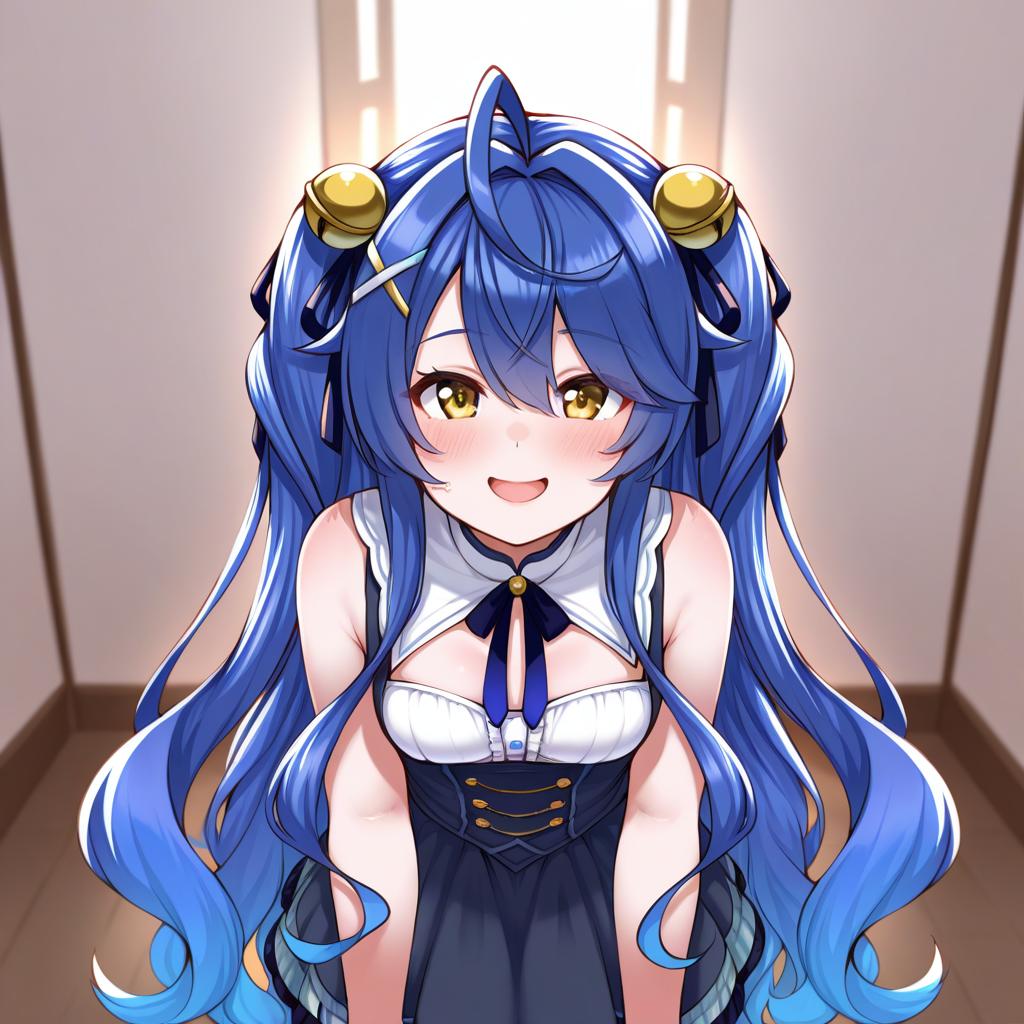 Amamiya kokoro, nijisanji, 1girl, skin fang, yellow eyes, hair between eyes, blue hair, very long hair, long hair, x hair ornament, ahoge, two side up, twintails, hair bell, hair ribbon, small breasts, virtual youtuber, virtual youtuber, jingle bell, by artist disco brando, illustrious