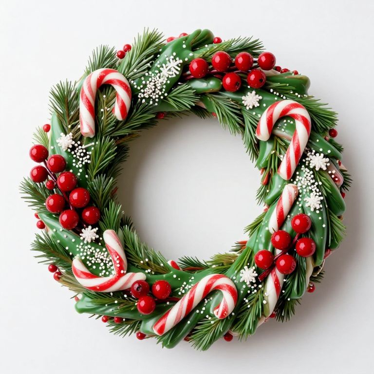 A whimsical Christmas candy wreath emerges as a fantastical vision, where glossy green branches, vibrant red berries, and sparkling white sprinkles blend into an otherworldly confectionery realm, defying the boundaries between food and art.