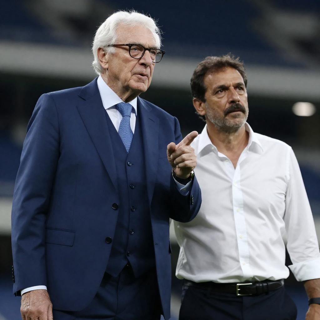 Photograph of an older man with white hair, glasses, and a blue three-piece suit, standing beside a younger man with dark hair and a mustache, wearing a white shirt with the top button undone. They are in a dimly lit stadium, with the older man pointing and the younger man looking at him.