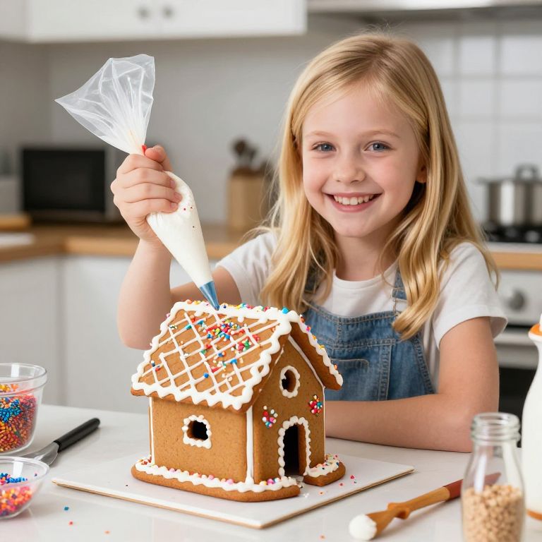 Blonde-haired girl smiling brightly while decorating a gingerbread house with colorful sprinkles and royal icing, holding a piping bag and surrounded by baking supplies on a kitchen counter.