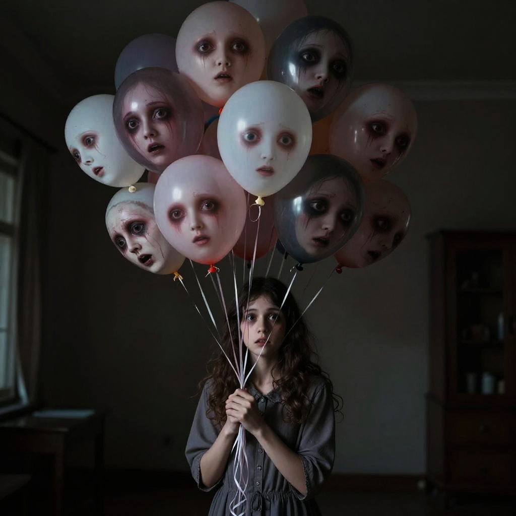 Hyperrealistic art An unsettling and creepy portrayal of 1 girl clutching a bunch of (human head ) balloons, each created from lifelike features. The composition captures the disturbing juxtaposition between the girl's innocent demeanor and the macabre nature of the scene. The horror style adds an unsettling quality, creating an atmosphere of unease and shock. (Macabre Collection:1.4), (Chilling Balloon Assembly:1.3), (Eerie Contra BREAK 1.2), (Horror Styling:1.2), art influenced by psychological horror films and dark fantasy. (masterpiece, best quality:1.5), ultra-realistic, 32k, RAW photo, (high detailed skin:1.2), 8k uhd, DSLR, soft lighting, high quality, film grain, Abdul Djalil Pirous, photographic, realism pushed to extreme, fine texture, incredibly lifelike