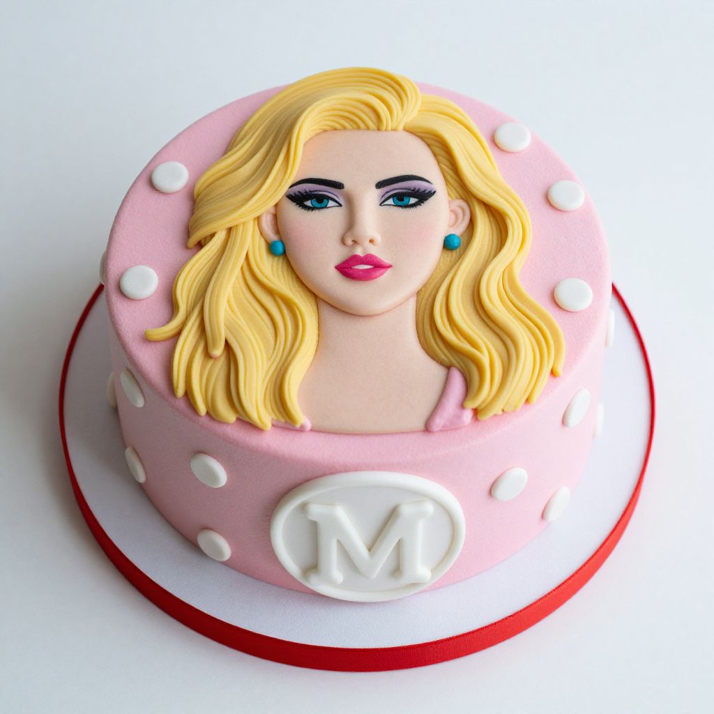 Artfully crafted cake featuring a detailed portrait of a blonde woman with bold makeup, set atop a pink frosted base adorned with white polka dots and a central \"M\" monogram, presented on a white platter with a red ribbon trim.