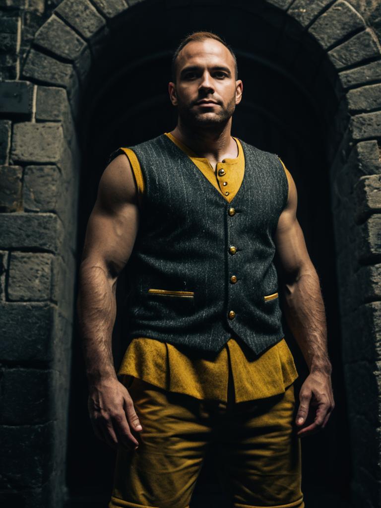 Portrait of a muscular man standing confidently in front of a stone archway. He is wearing a gray pinstriped vest with gold buttons over a mustard yellow shirt, paired with matching brown shorts. The background features rustic stone walls, creating a dramatic and medieval-like atmosphere.