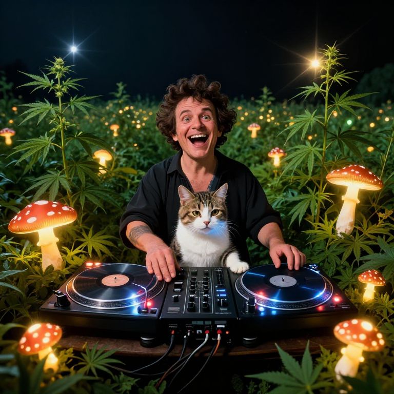 Photograph of curly-haired man with excited expression, DJing with cat on lap, surrounded by glowing mushrooms and plants at night.