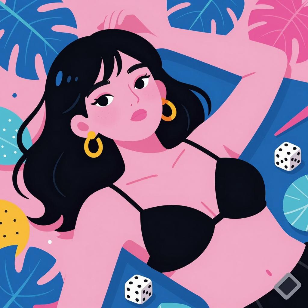 Illustration of an East Asian woman with long black hair, wearing a black spaghetti-strap top and red-orange skirt. She sits with one arm raised, smoking, and her eyes closed in relaxation. A white and gray cat sits on her skirt. A green potted plant with large leaves is in the background. Her left leg is extended forward, and her right leg is bent. The woman has light skin and a slight smile. The background is a warm, beige color. The illustration has a soft, painterly style.