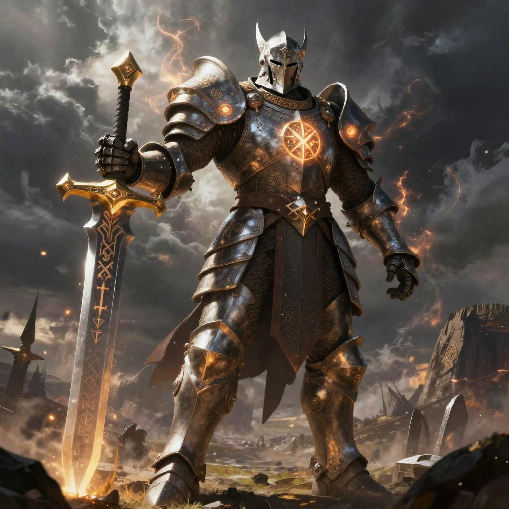 Goliath rune knight standing tall on a battlefield, colossal armored figure adorned with glowing ancient runes, wielding a massive rune-etched sword, mystical energy radiating around, stormy skies in the background, epic fantasy art style.