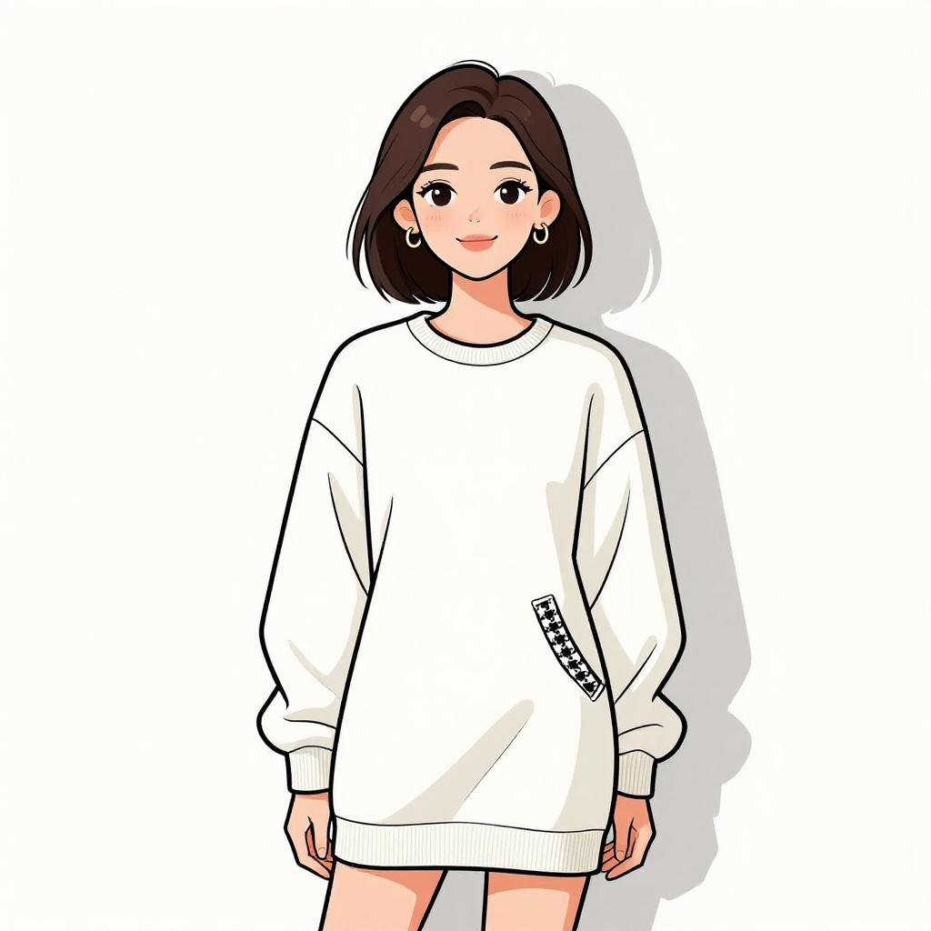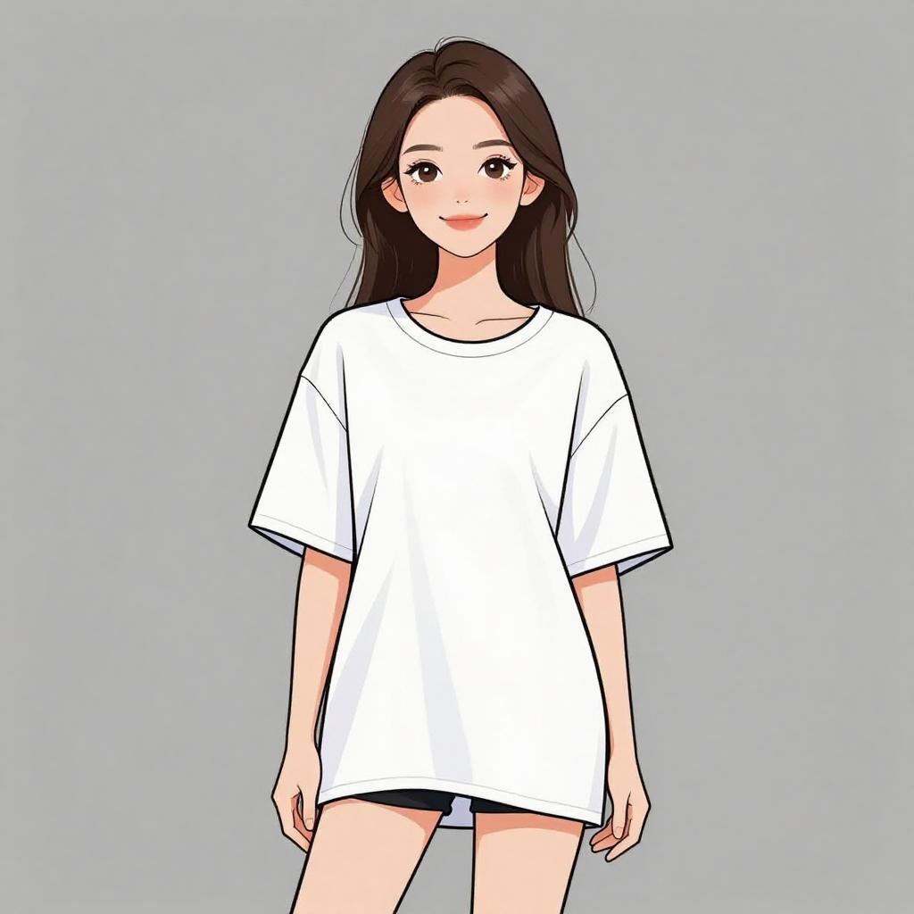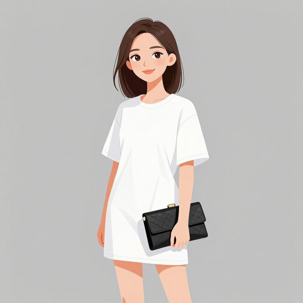 Woman with pretty face and pretty hair. smiling Woman, minimalistic, oversized plain white t-shirt dress, short sleeves, mid-thigh length, relaxed fit, carrying a textured oversized black clutch, simple straight hairstyle, studio grey background. --sref 1467