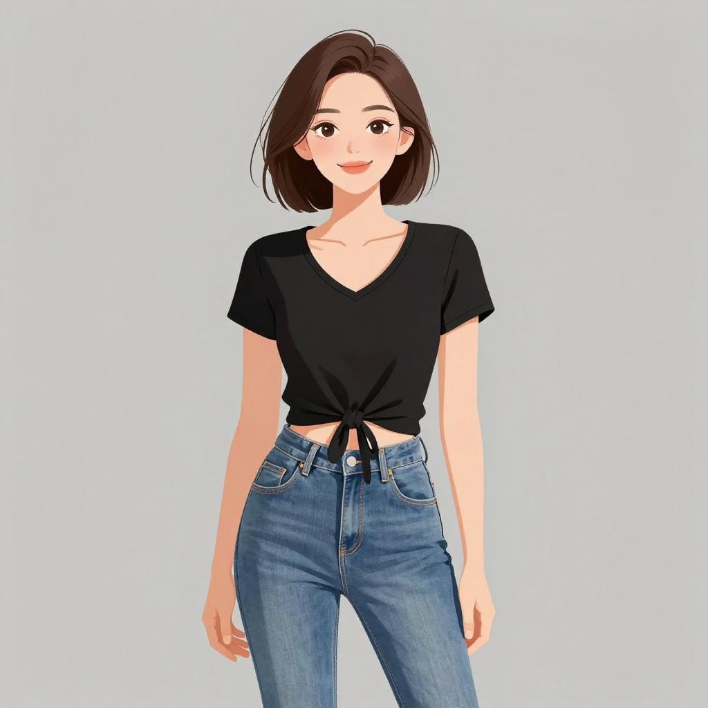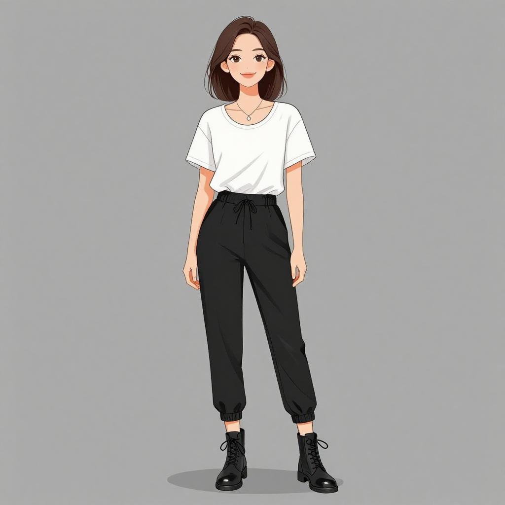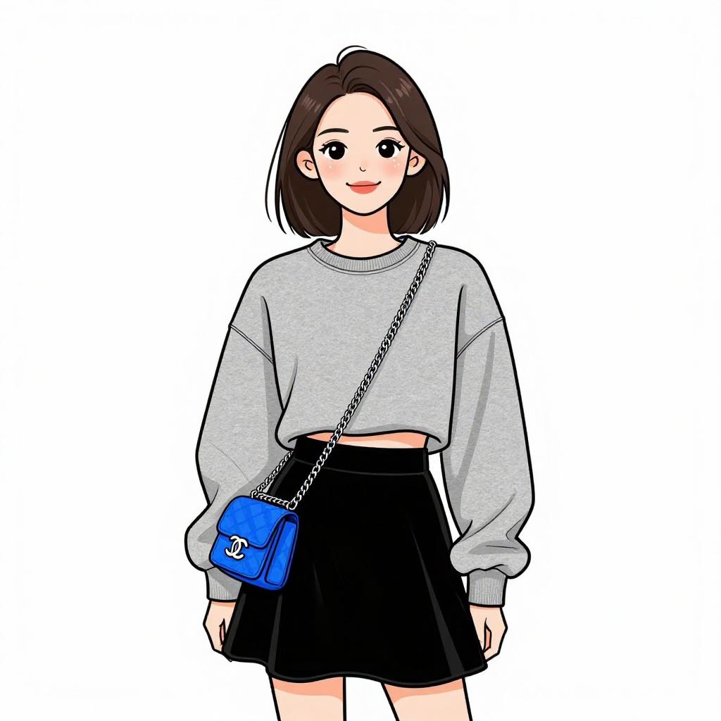 Woman with pretty face and pretty hair. smiling Woman, minimalistic, oversized plain white t-shirt dress, short sleeves, mid-thigh length, relaxed fit, carrying a textured oversized black clutch, simple straight hairstyle, studio grey background. --sref 1467