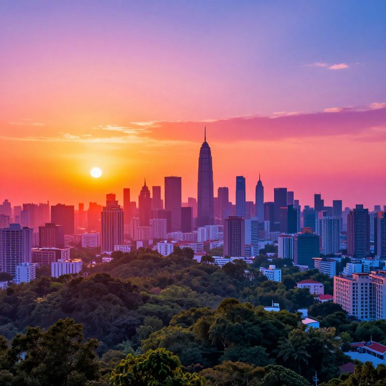 Photograph of a vibrant sunset over a city skyline, featuring colorful sky gradients, silhouetted skyscrapers, and lush greenery below.