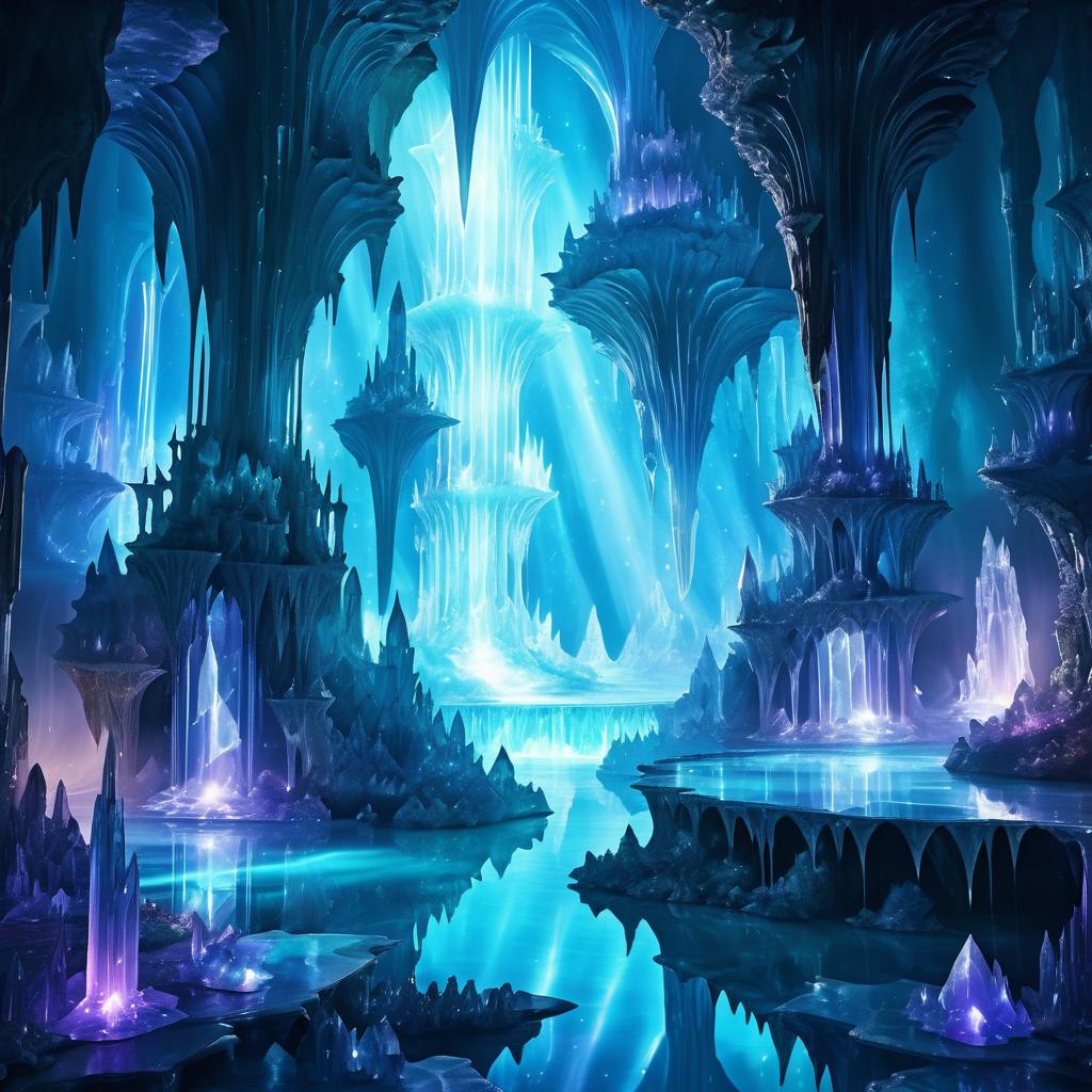A fantastical crystal cave featuring colossal shimmering stalactites and stalagmites, illuminated by glowing pools of water. The scene exudes a magical atmosphere with vivid blue and purple hues, highly detailed with reflective surfaces and intricate crystalline formations.