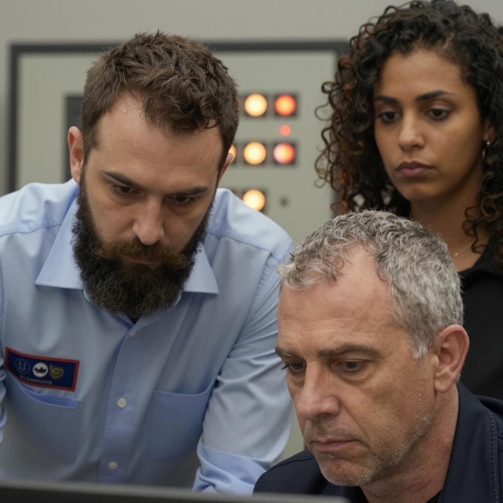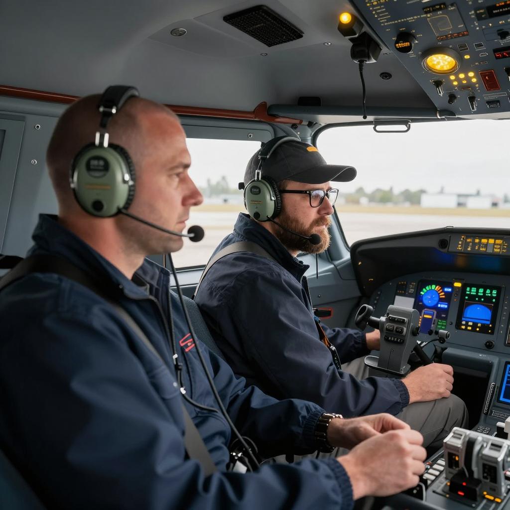 Two men in a cockpit, wearing headsets. The man on the left has a bald head, light skin, and is focused. The man on the right has a beard, glasses, and a cap, concentrating on controls. Yellow lights and a blue light on the dashboard. Both have dark blue jackets. The man on the right's hands are on the controls. The cockpit is cluttered with equipment.