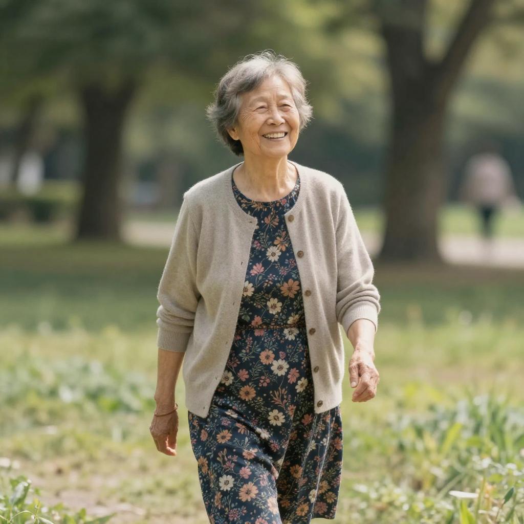 Realistic photo.a joyful grandmother, wearing a cozy cardigan and a flowered dress, walking through a sunny park, expressing warm happiness, depicted in the reflective and minimalist style of Tadao Tsuge. realistic photo