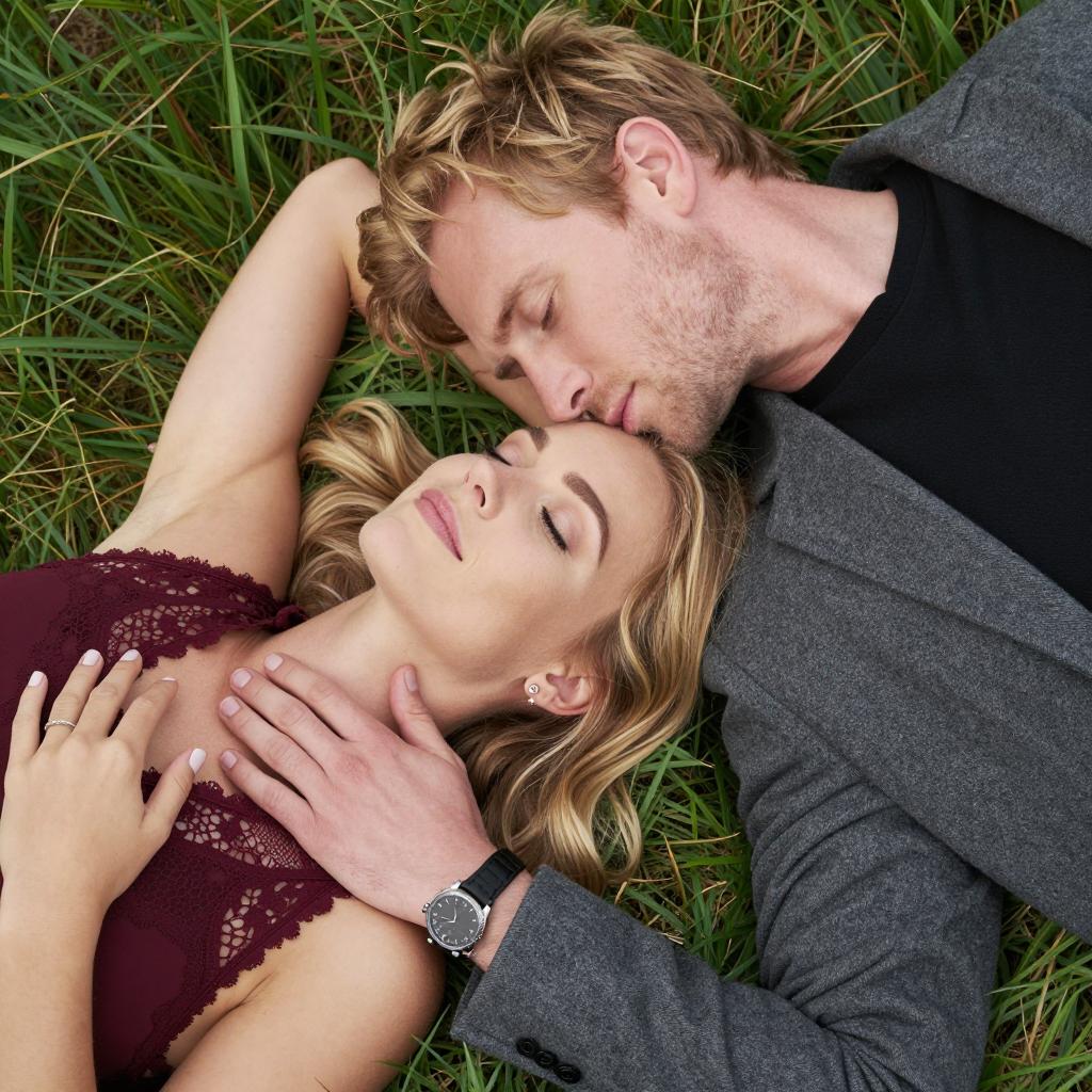 A couple lying on grass. Blonde woman with closed eyes, wearing a maroon lace top, lies on her back. Man with tousled blonde hair, wearing a gray jacket and black shirt, kisses her forehead. His right arm is under her head, and his left hand rests on her chest. His eyes are closed. She has a relaxed expression, and he looks tender. Both are partially covered by grass. His wristwatch is visible on his left wrist.