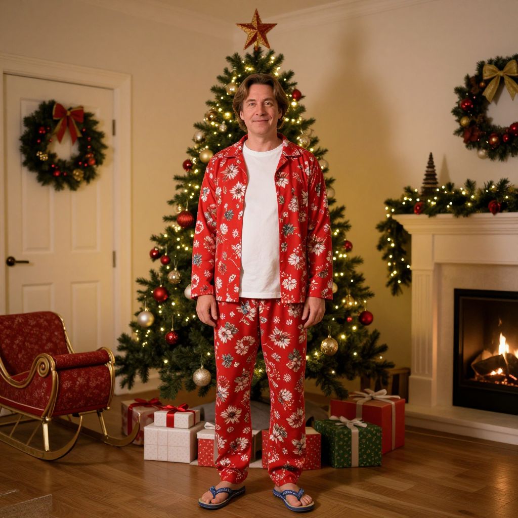A man in his late 30s with warm brown hair and a friendly, relaxed expression is wearing a red floral pajama set with a white t-shirt underneath and a pair of colorful flip flops. He is standing confidently in front of a beautifully decorated Christmas tree, adorned with twinkling lights, ornaments, and a red and gold star at the top. In the background, there are other festive items like a sleigh, a Christmas wreath on a door, a cozy fireplace, and a few gift boxes scattered on a wooden table. The scene is set in a cozy, warmly lit living room during the holiday season, with soft golden-hour lighting casting a gentle glow across the room. The atmosphere is joyful and festive, with a touch of whimsy and charm.