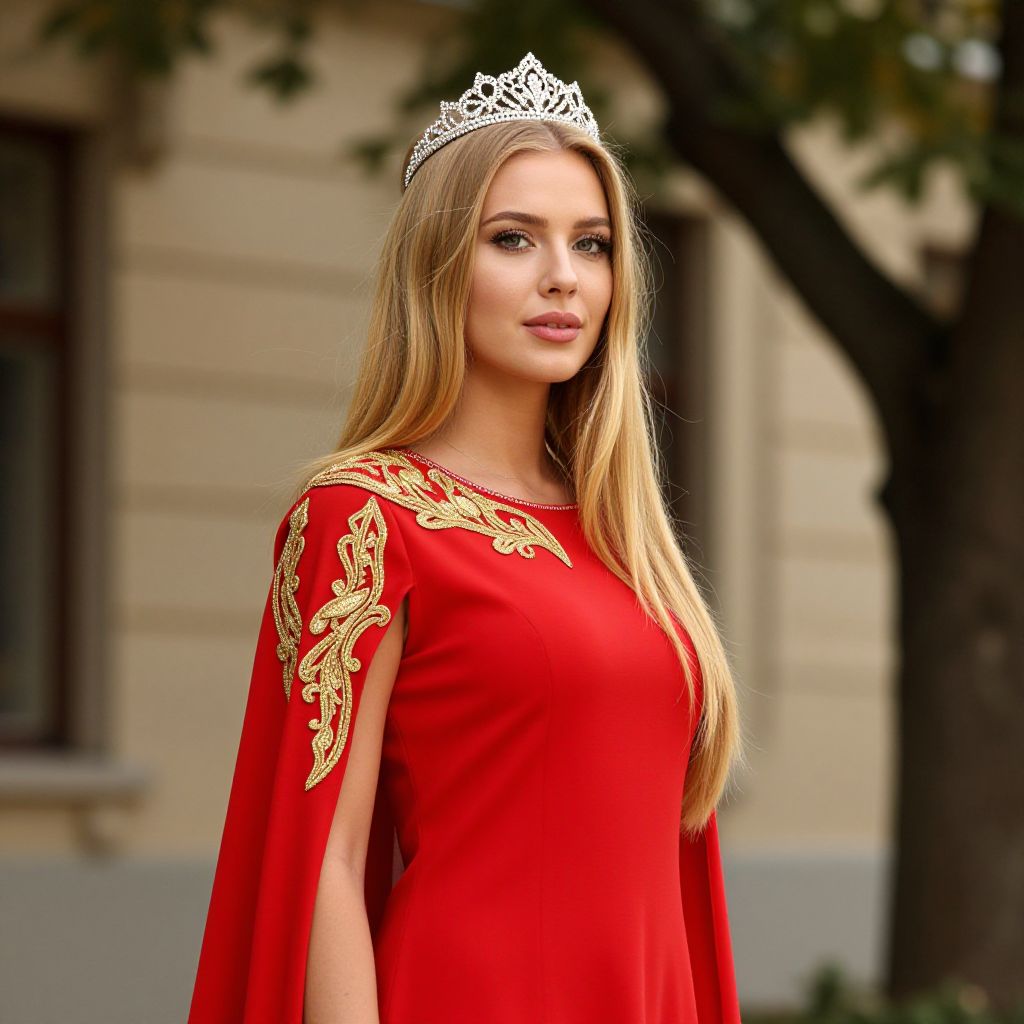 Woman with long blonde hair wearing a red dress with gold embroidery on the shoulders and a crown on her head. She is standing in front of a building with a tree in the background.