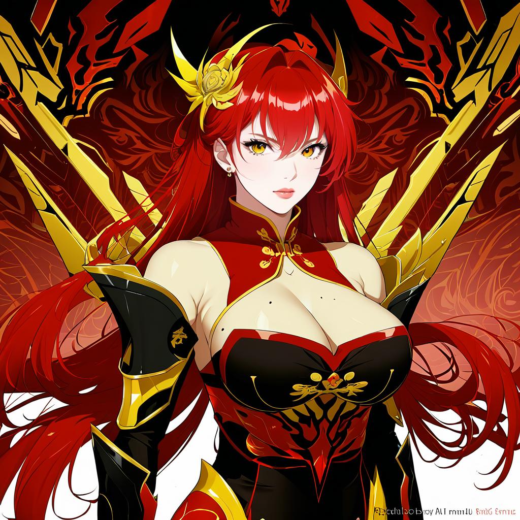 Illustration of Murata Himeko from the Honkai series depicted as Vermillion Knight. The character features long red hair, vibrant yellow eyes, and a distinctive hair ornament shaped like a golden rose. She wears a form-fitting red and black china dress combined with an armored leotard accented with gold elements. The outfit includes black gloves and bare shoulders, highlighting a mole and cleavage detail on the chest.
