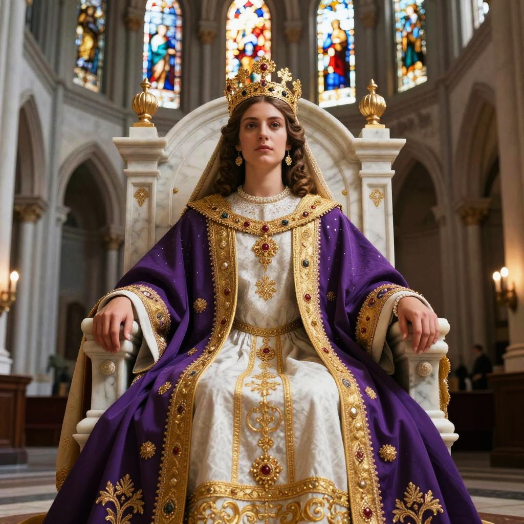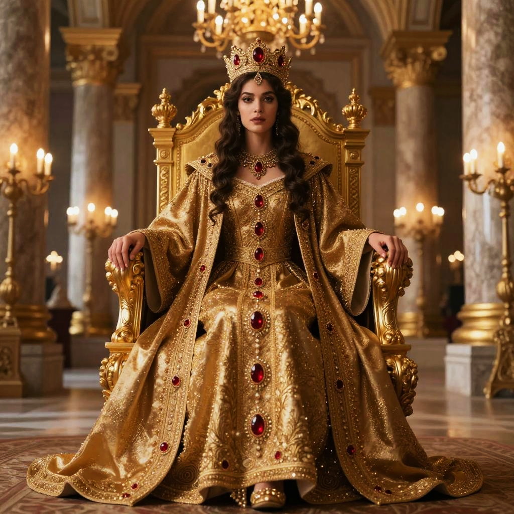 Photograph of a regal woman with long dark hair, wearing an ornate gold crown and gown with red gemstones, seated on a grand golden