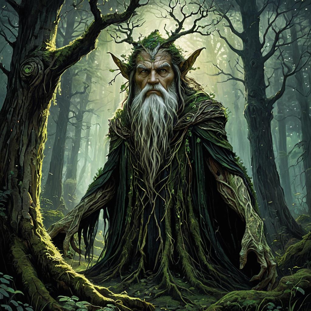 Fashion costume concept, photorealistic digital oil painting, hyper realism, a wise old tree spirit with gnarled branches, moss-covered bark and glowing green eyes, volumetric light and shadow, twilight forest clearing with soft mist, hyper-detailed, highly intricate, beautiful, smooth, sharp focus, elegant, fantasy style, by John William Waterhouse, Nene Thomas